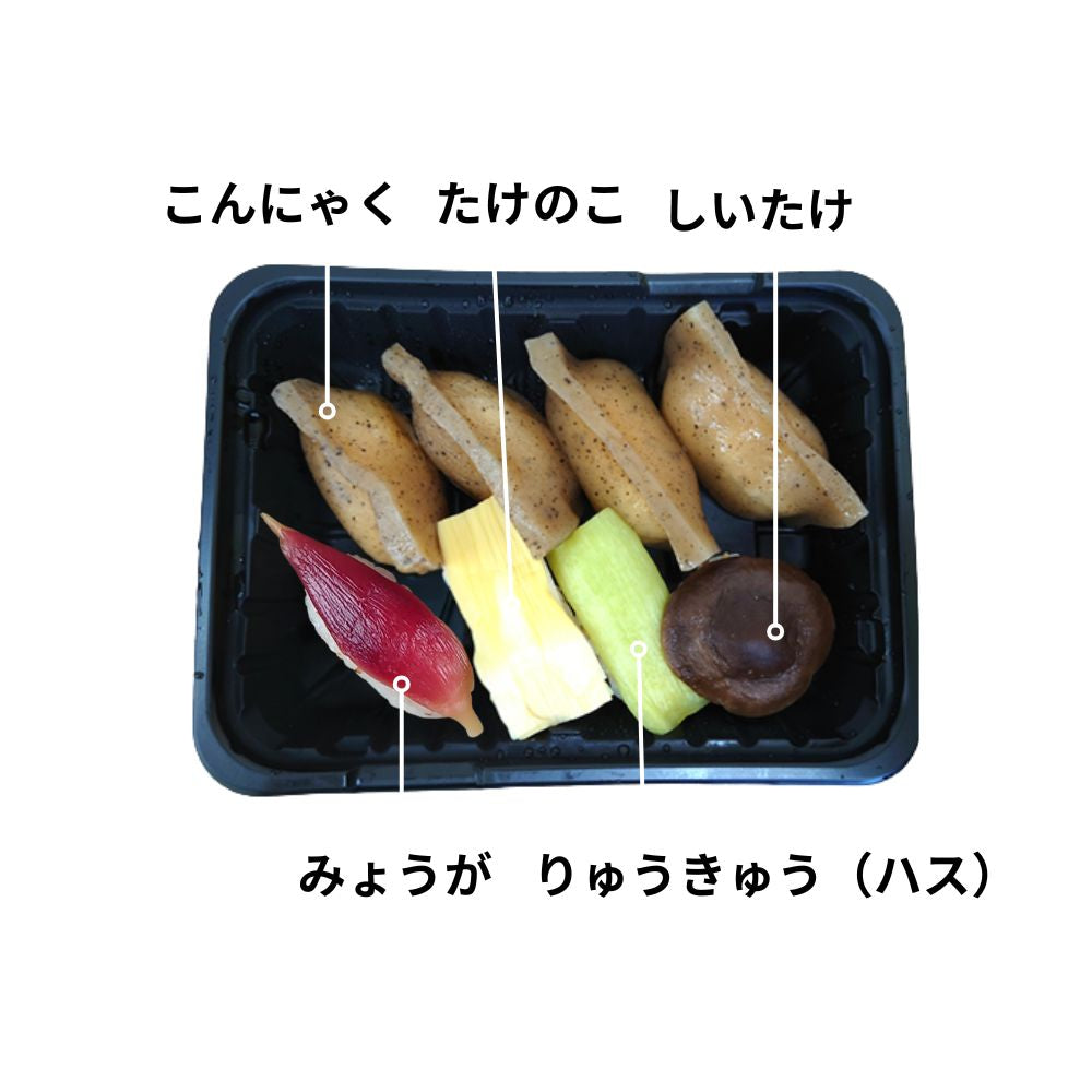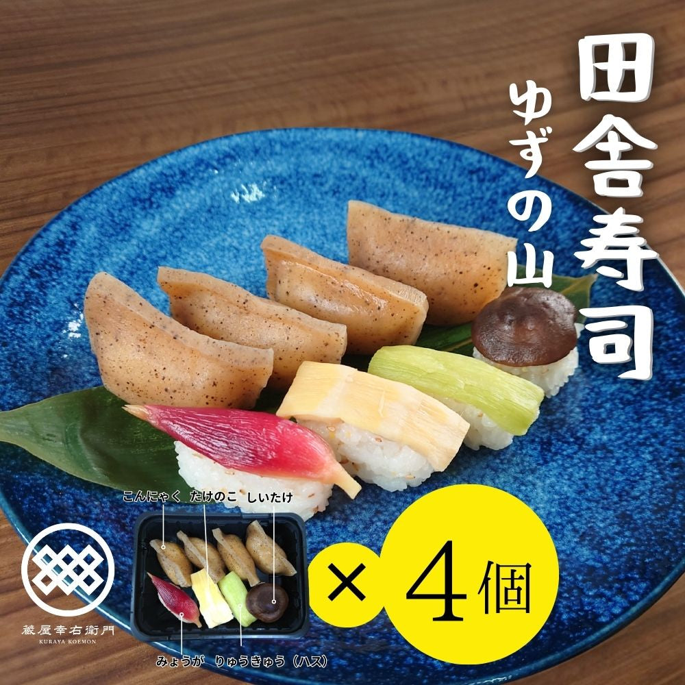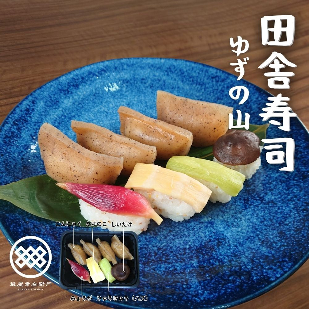 田舎すしは、ゆず酢のきいた酢飯に、山の幸をネタにしたプラントベースの寿司です。